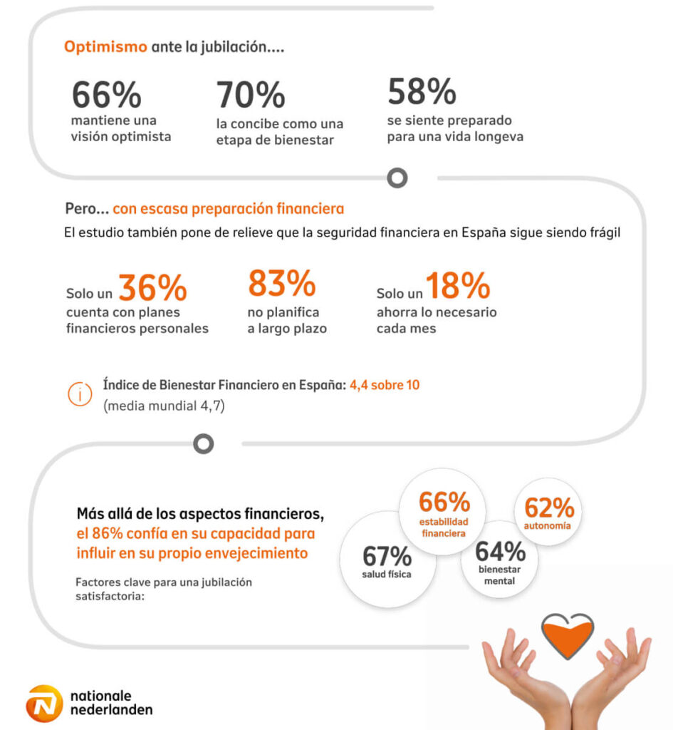 En este sentido, el 58 % de los españoles considera que está preparado para una vida longeva y el 68 % cree que su jubilación se ajustará a sus expectativas.